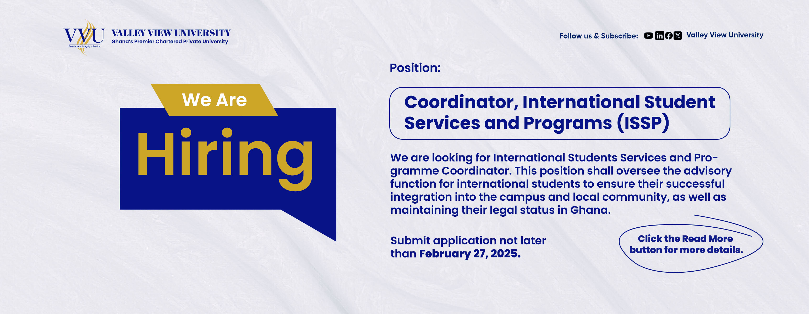 We are looking for International Students Services and Programme Coordinator. This position shall oversee the advisory function for international students to ensure their successful integration into the campus and local community, as well as maintaining their legal status in Ghana. This involves the oversight of processing of Non-Citizen Ghana card, residence permits as well as issues regarding immigration application.