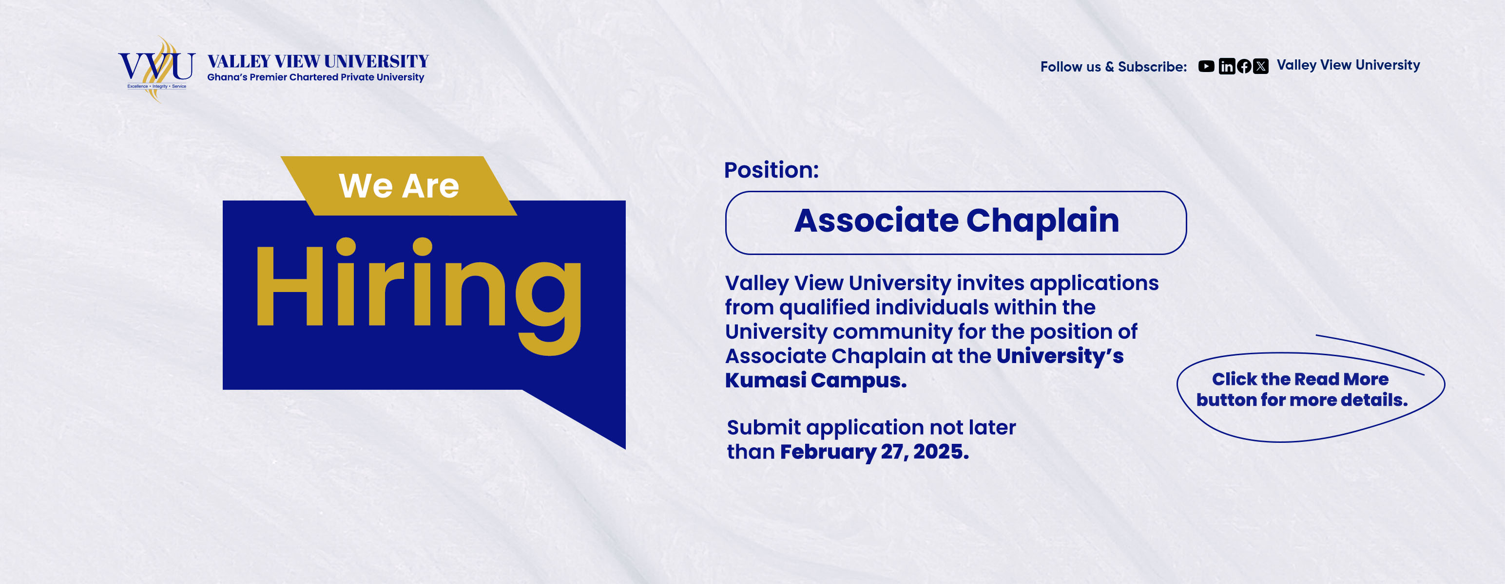 Valley View University invites applications from qualified individuals within the University community for the position of Associate Chaplain at the University’s Kumasi Campus.